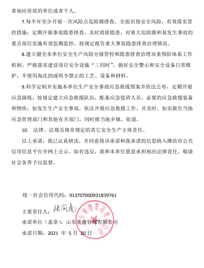 萊德管閥作出安全生產(chǎn)信用承諾