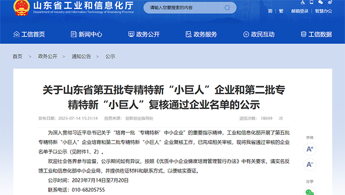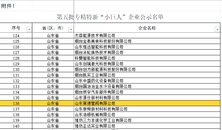 2023年7月14日,山東省工業和信息化廳發布了由工業和信息化部開展的第五批專精特新“小巨人”企業培育和第二批專精特新“小巨人”復核通過企業名單。山東萊德管閥有限公司榮膺國家級專精特新“小巨人”企業。